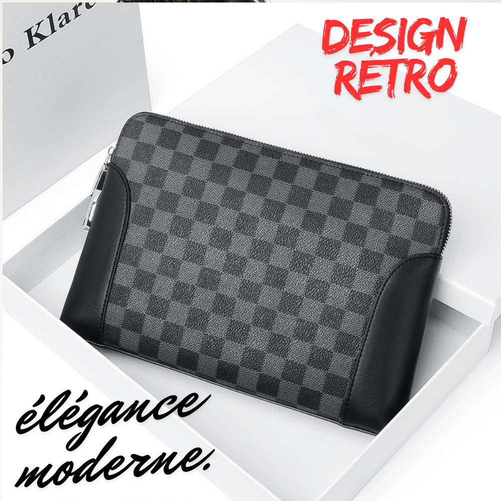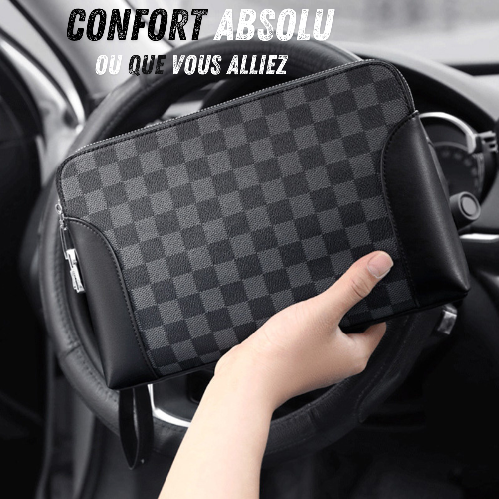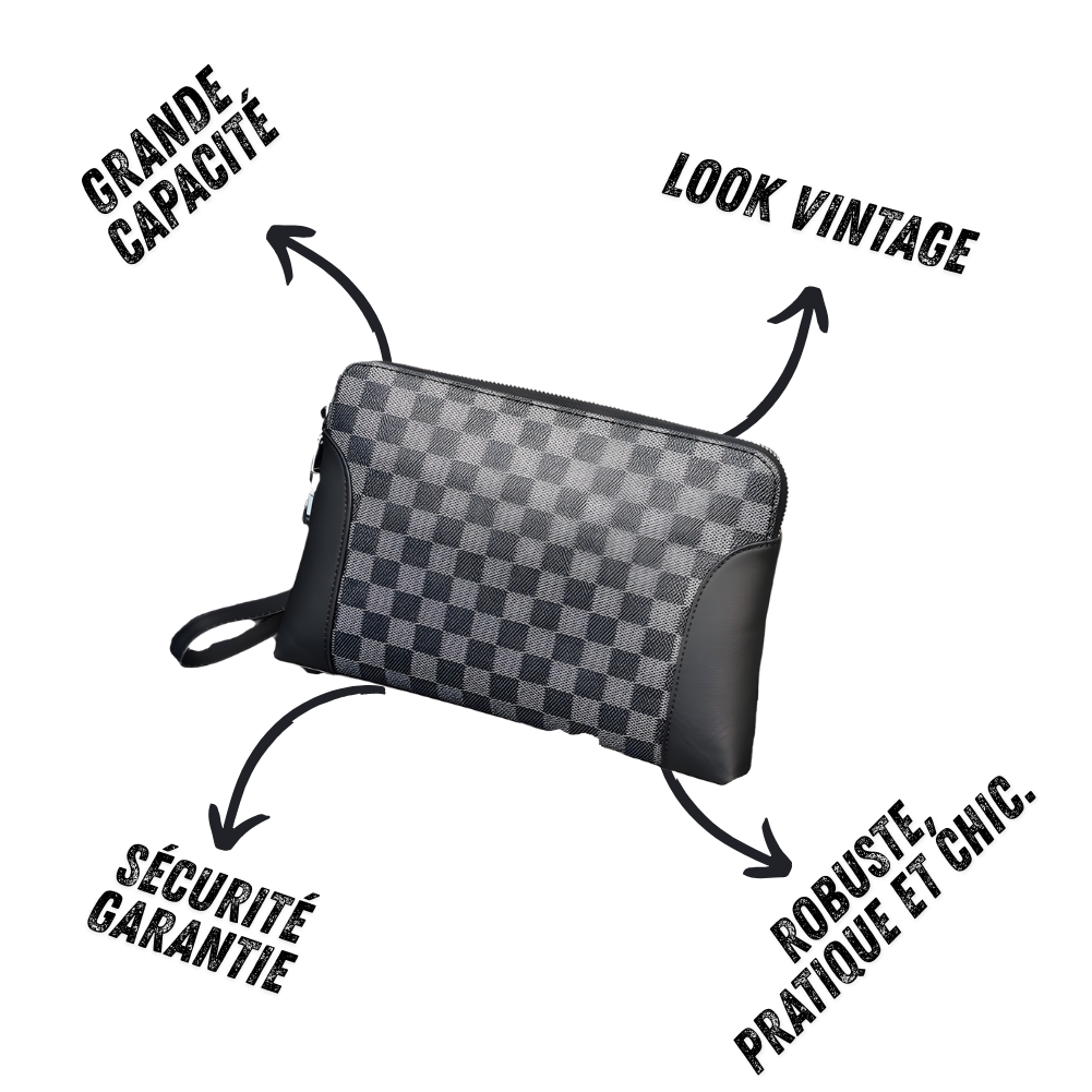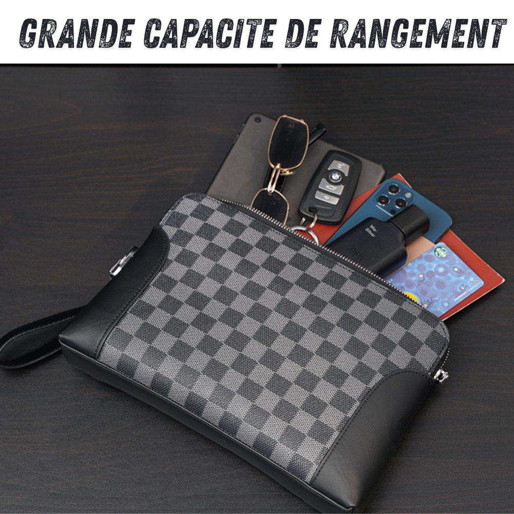 Son cuir raffiné, son motif quadrillé intemporel et sa prise en main confortable en font un accessoire à la fois pratique et prestigieux.