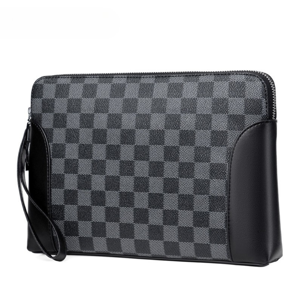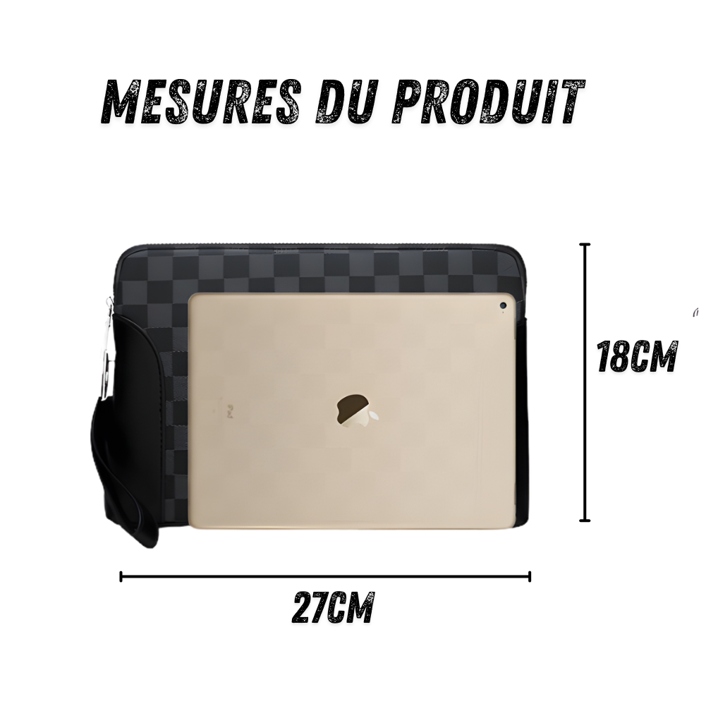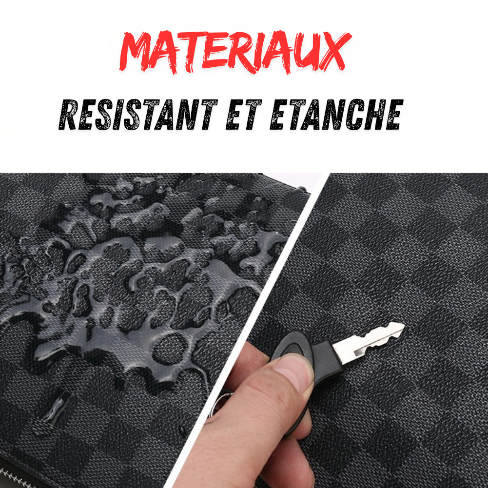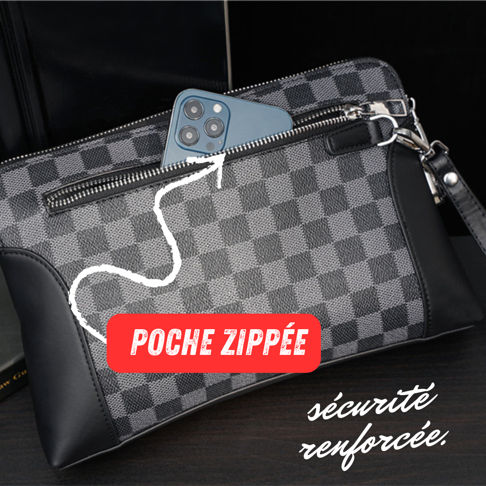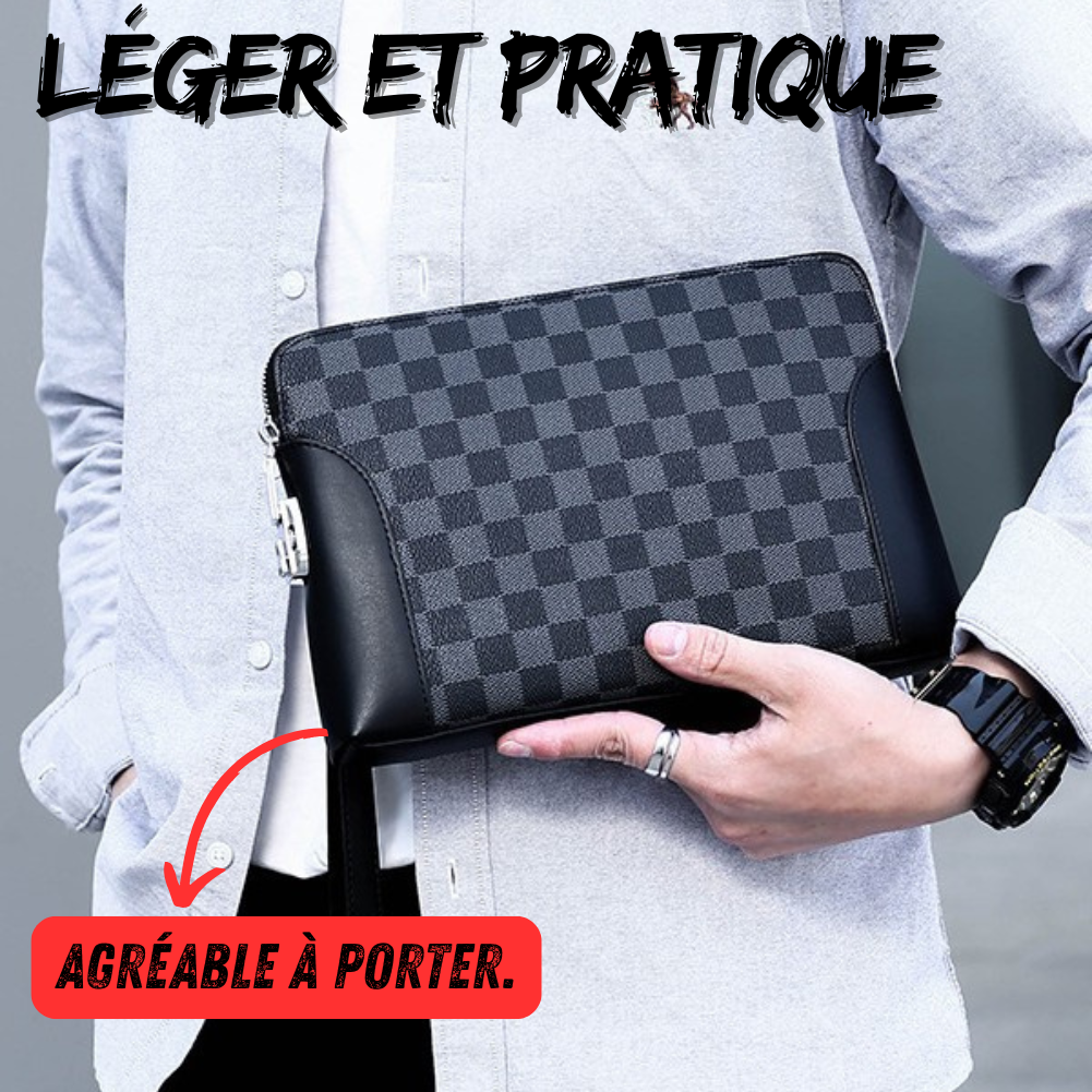 Son cuir raffiné, son motif quadrillé intemporel et sa prise en main confortable en font un accessoire à la fois pratique et prestigieux.