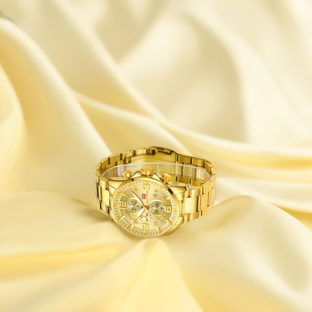 Son cadran aux finitions parfaites et son bracelet doré en acier inoxydable expriment puissance, assurance et raffinement. Chaque détail a été conçu pour offrir une allure distinguée aux hommes modernes qui aiment se démarquer.